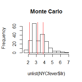 hist(unlist(NYCfever$llr), main="Monte Carlo")