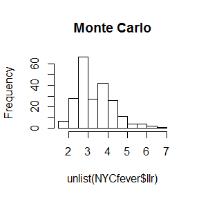 hist(unlist(NYCfever$llr), main="Monte Carlo")